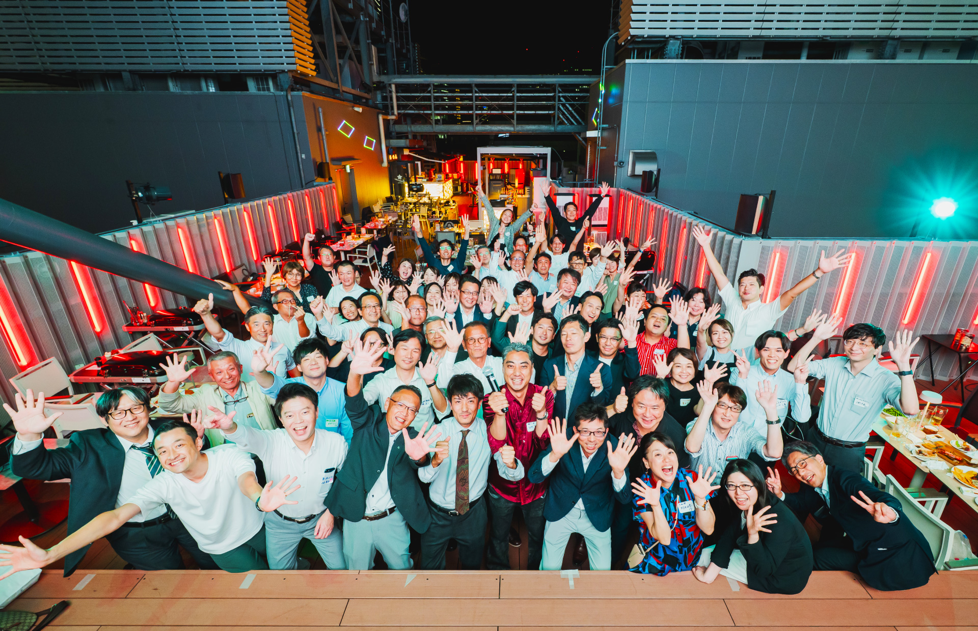 当日は、お客様・協力会社の皆様・ご友人をお招きし、新橋グランハマーの屋上BBQスペースを貸し切って、42社・72名による交流会を開催しました。